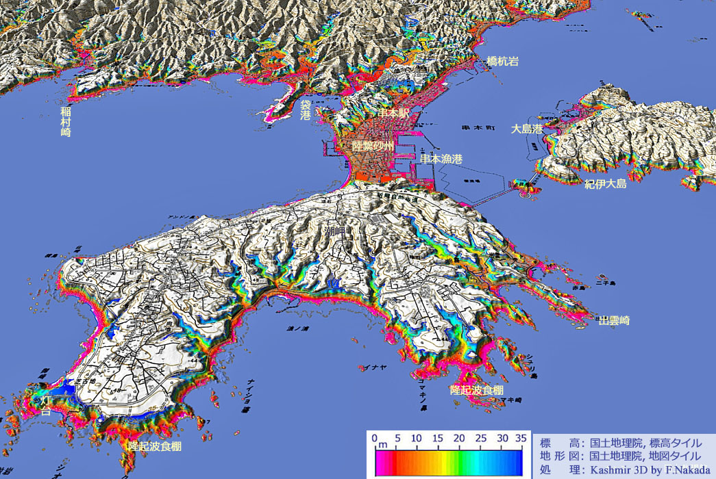 岬は紀伊本土から孤立した島であったが,潮流が運ぶ砂によって両者は結ばれた。 このような島を陸繋島(りくけいとう)と呼んでいる。 このタイ(Tie)になる砂嘴の上に串本の町がある。