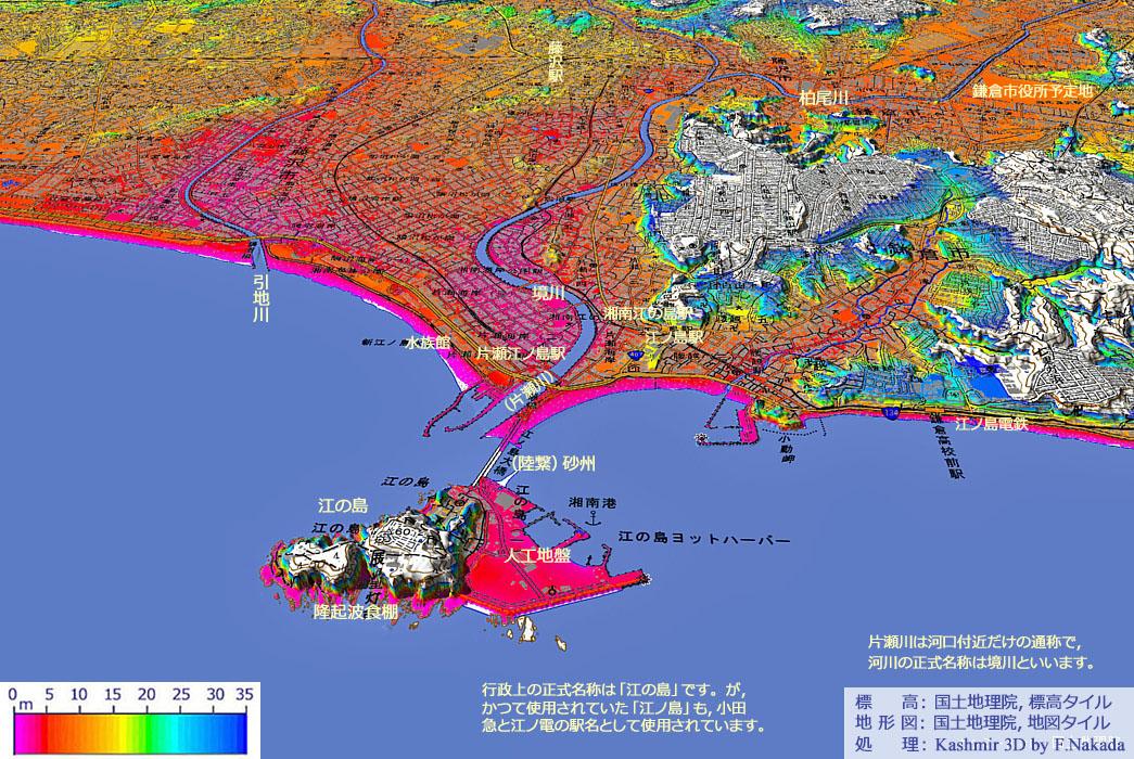 昭和の年代になってからも度々,広重の絵のようなことを繰り返している。 つまり砂嘴は短期間に伸びたり縮んだりする。 もしこれがくっつき通しならば,江ノ島にある鎌倉時代の僧の修行地の洞窟の意味がないわけだ。 それは,当時の鎌倉から人間世界を隔絶して,この洞窟において忍従の訓練を積んでいたのだから,そう簡単に行き来できるようでは,厳しい生活が乱される。 だからこそ人里はなれたこの島を選んだ。-中略-