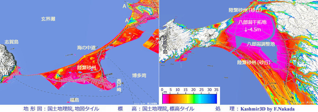 江ノ島と地形が似ているのは西の国,筑前博多の北にある志賀ノ島がある。 砂嘴の部分は江ノ島より大きく,博多湾を玄界灘の波浪から守り「海の中道」と呼ばれる。