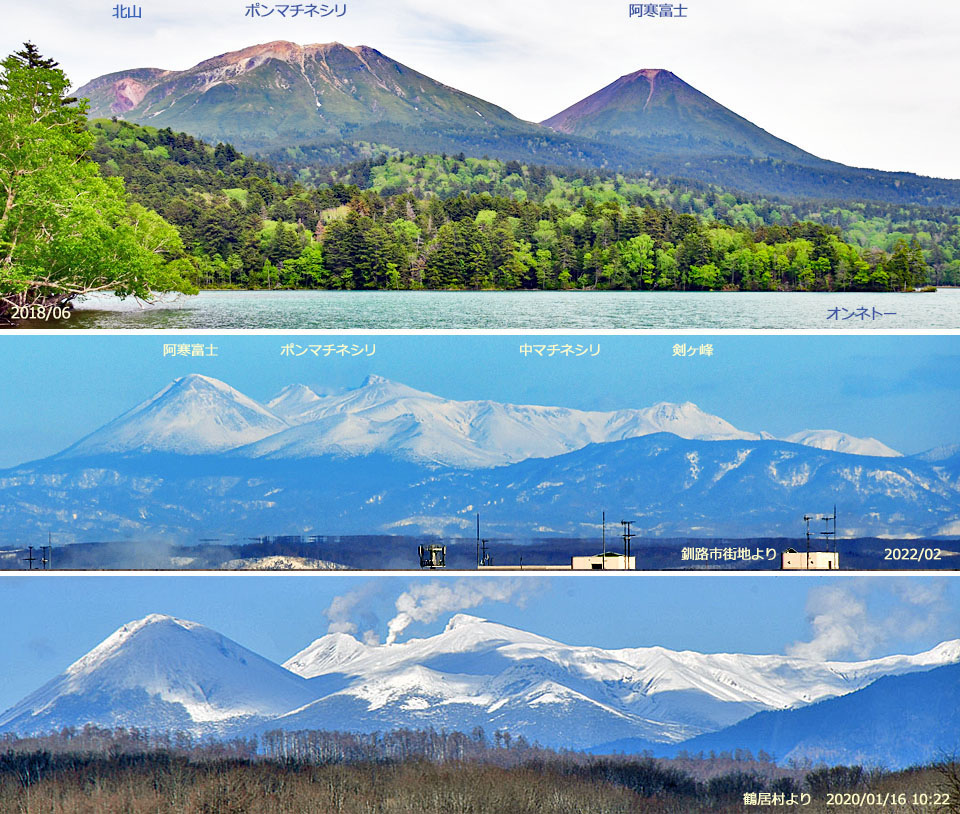 | 北海道:雌阿寒岳火山群(ポンマチネシリ,中マチネシリ,阿寒富士) |