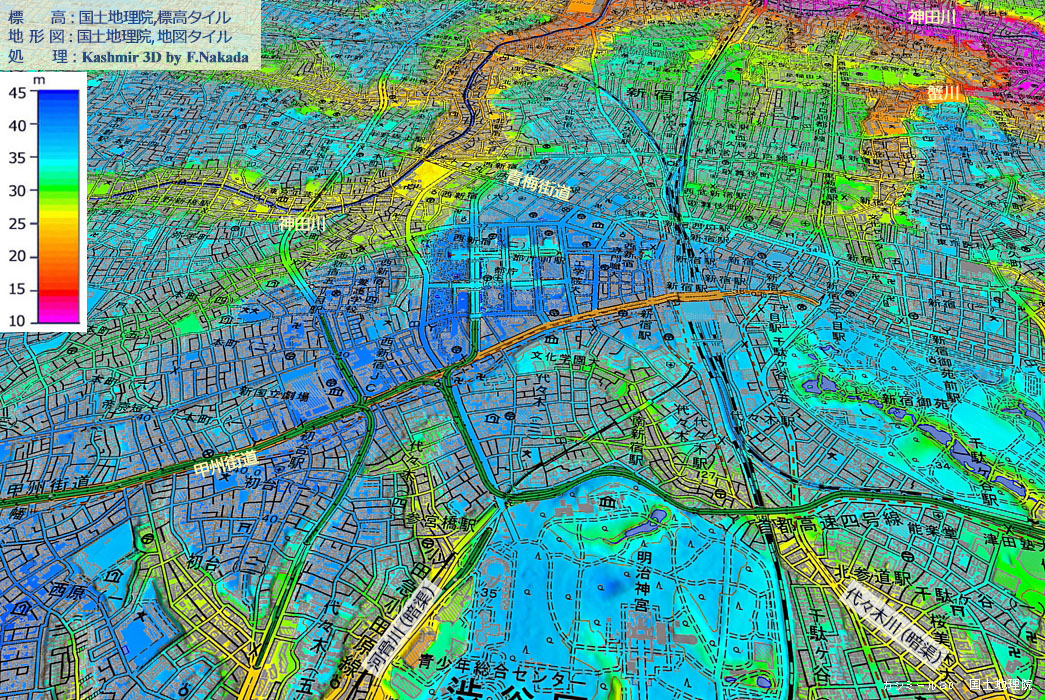 | 地形の三次元イメージ : 西新宿(角筈)~新宿(内藤新宿) |