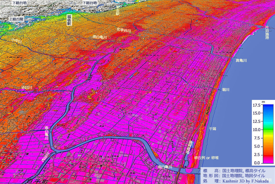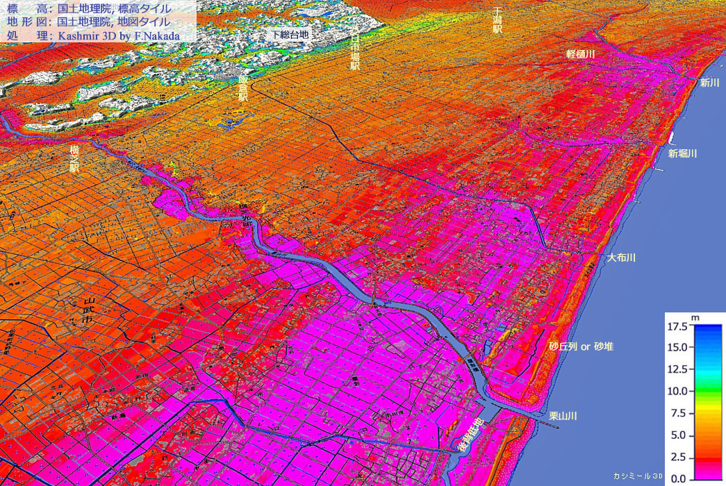 | 標高段彩図と地質の三次元イメージ : 九十九里海岸(新川~栗山川) |