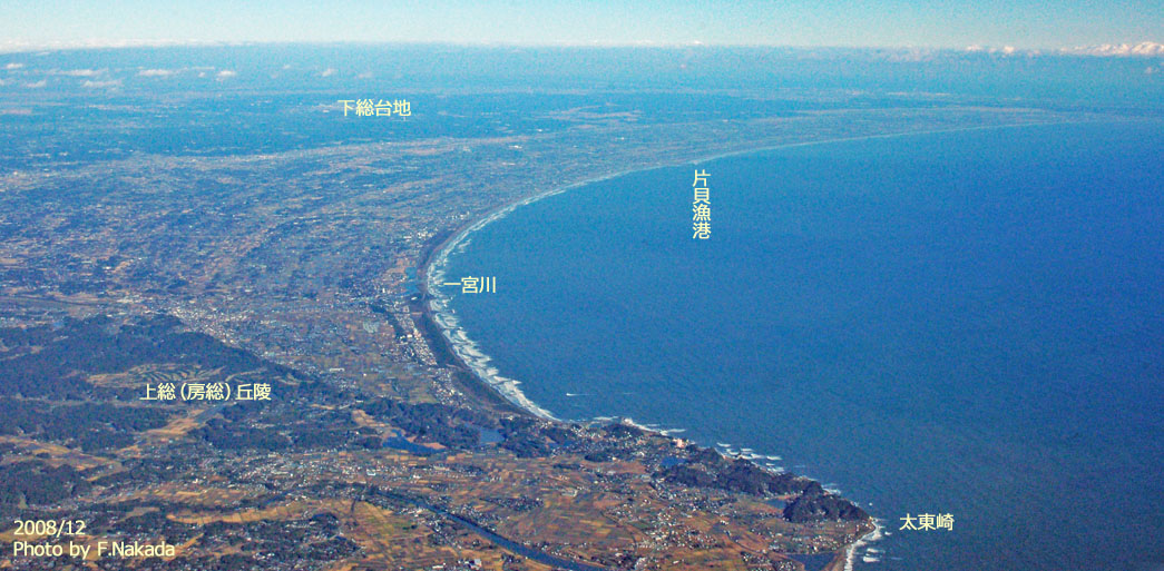 ![]() いすみ市の上空を,羽田空港に向かう途中で撮影しました。 「太東崎」を含む茂原市付近から房総半島南部にかけてを「房総丘陵」と言い,その基盤は「上総層群」です。 一方,茂原市付近から犬吠埼にかけては「下総台地」と言い,その基盤は「下総層群」です。 |