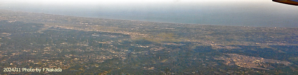 ![]() 千葉市と東金市(画像中央)のほぼ中間の上空を,羽田空港に向かって飛行している時に撮影しました。 画像右下の大団地は,大網白里市の「みどりが丘」です。 大網駅までバスを利用し,その後は外房線で千葉や東京に出るのでしょうか? |