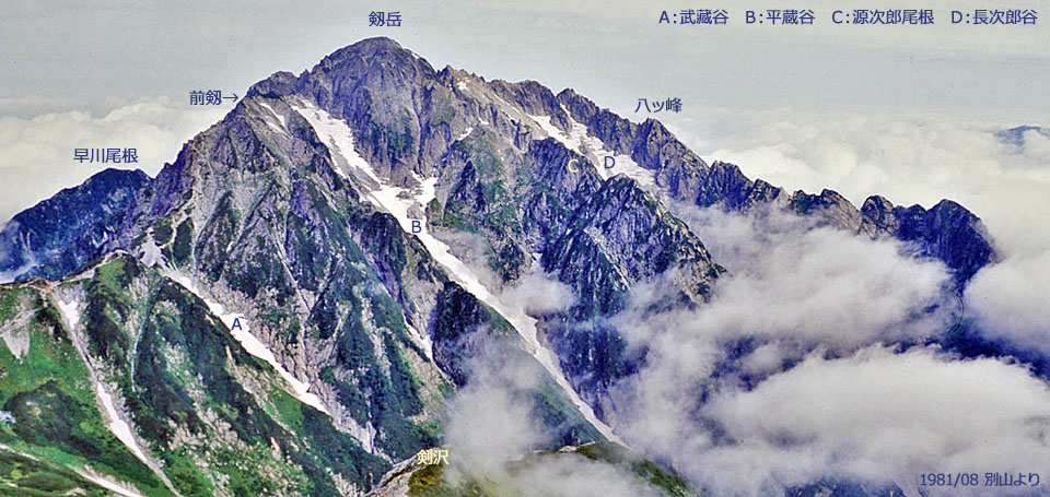 ![]() 撮影場所の関係で,源次郎尾根の向こう側は写っていません。 夏季の雪渓をイメージしてみてください。 |