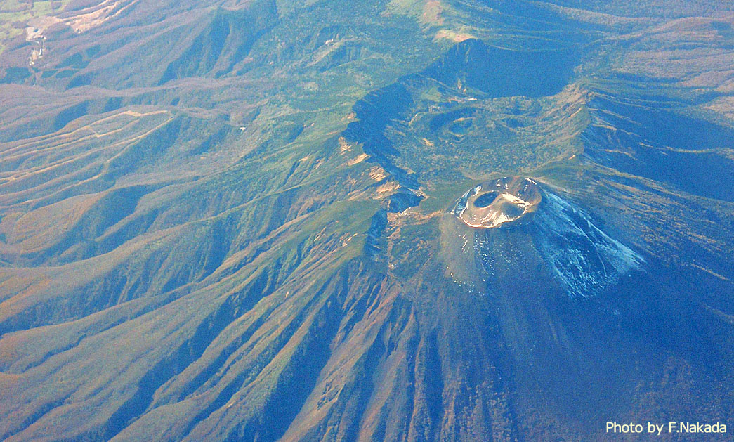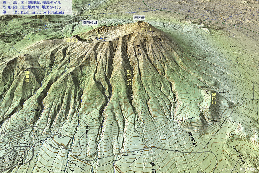 ![]() 手前の「東岩手火山(薬師岳)」は,山頂の火口が2重になっており,何回も噴火が続いたことがわかります。 奥の大きな楕円形のカルデラは「西岩手火山」によるものです。 カルデラのほぼ中央に「御苗代湖」などの火口湖が存在しています。 |