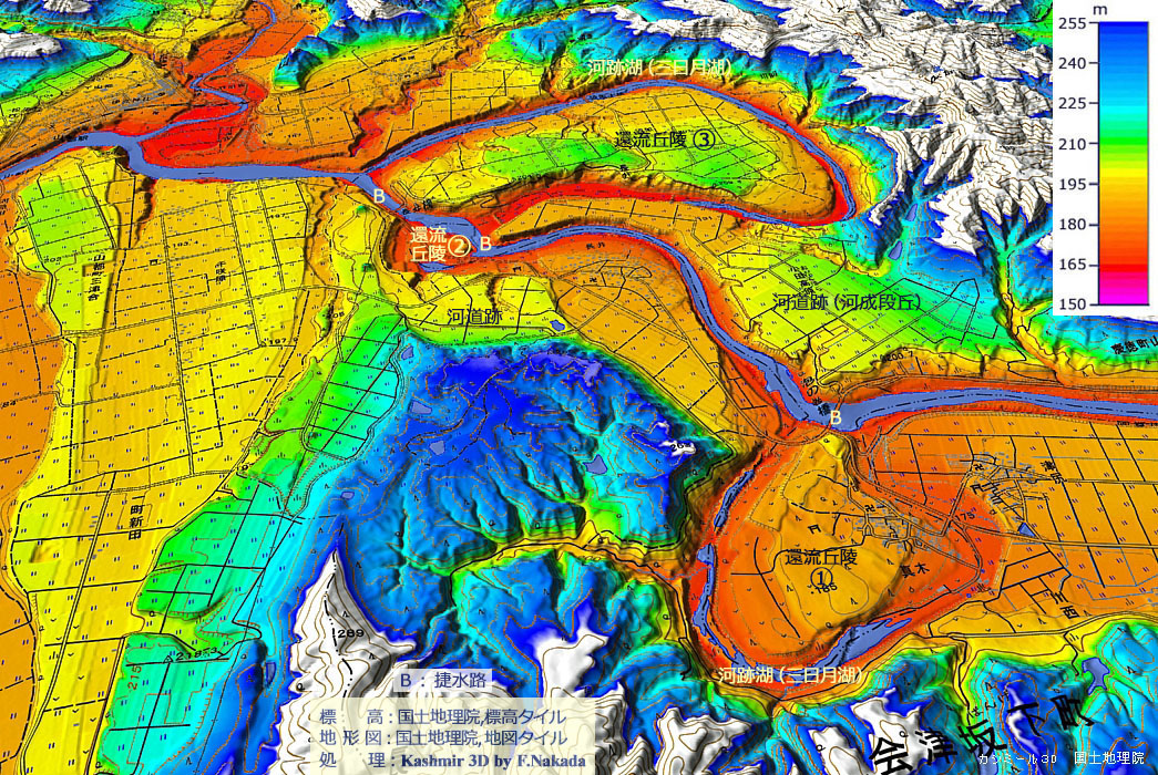 ![]() ①の「環流丘陵」の旧河道には,いわゆる「三日月湖」が残っています。 また,この環流丘陵には,2段あるいは3段の河岸段丘が存在するようです。 ②と③は,いわば一体ものの「穿入蛇行」の結果でしょう。 阿賀川はまず②を環流(蛇行)し,そのまま現阿賀川を突っ切って③を環流(蛇行)していました。 いわゆる「蛇行切断」が行われて,環流丘陵が形成されたのですが,実は洪水で切断されたのではなく, 大正10年から開始された大規模な「捷水路」工事によって切断されたものなのです。 地形的には環流丘陵なのですが,人の手で切断されたので「(人工)環流丘陵」と称しました。 |
