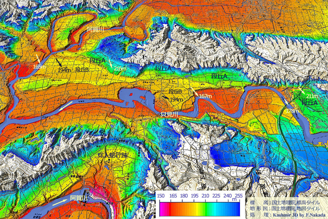 環流丘陵,蛇行切断,捷水路,河岸段丘(河成段丘),新期断層変位地形,活断層 |