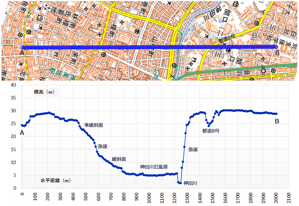 ![]() 地形断面図付近の地形は,神田川の右岸(南側:図左側)は「氾濫原」となっていて,いわゆる「軟弱地盤」です。 洪水と地震時の揺れ,という2種類のリスクの高い地盤です。 一方,左岸(北側:図右側)は「武蔵野台地」となり,上記のリスクが無いか極めて低い土地となります。 |