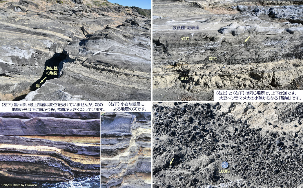 ![]() 遠くからですと,この「隆起波食棚」はほぼ平坦地のように見えますが,実際には1m~数mの凹凸があり, 海水が入り込んでいる亀裂も随所に存在しています。 ただ,砂地の所はあまりありません。 5万分の1地質図幅『三崎』によると,この隆起波食棚の地質は,新第三紀の「三浦層群,三崎層・Ms4(付加体)」と判定されています。 |