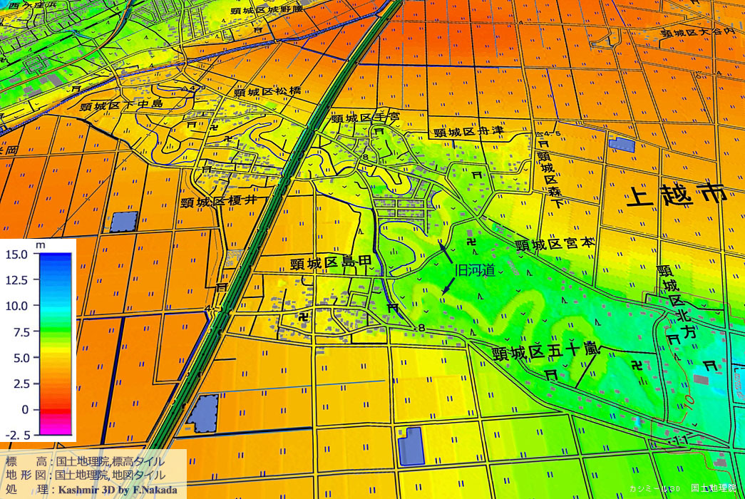 ‼マウスオーバー‼ 地図上にマウスを乗せてください。事務局が推定した「標高段彩図」を表示します。![]() これが保倉川の旧河道です。 旧河道の標高と後背湿地または自然堤防の標高差がほとんど無いため,地形図に表記しづらい旧河道が数ヵ所存在しています。 「マウスオン」で表示する「標高段彩図」には,地図記号が一切ないので,旧河道(流路跡)がわかり易くなっています。 下流側は,広大な「潟町砂丘」に吸い込まれてしまったかのようですね。 |