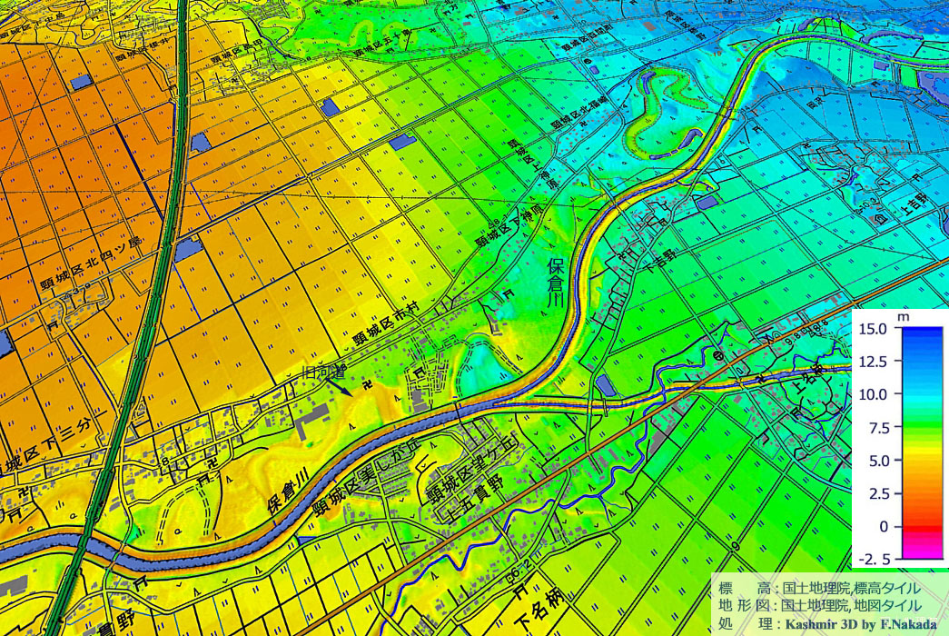 | 地形(標高段彩図)の三次元イメージ : 保倉川(ほくらがわ)と古保倉川 |