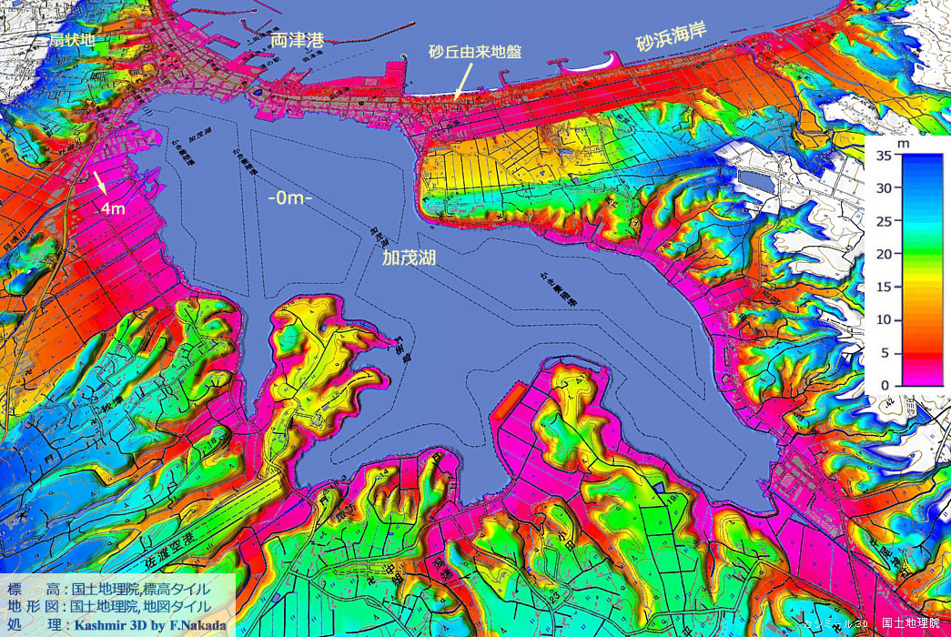 | 地形(標高段彩図)の三次元イメージ : 加茂湖 |
