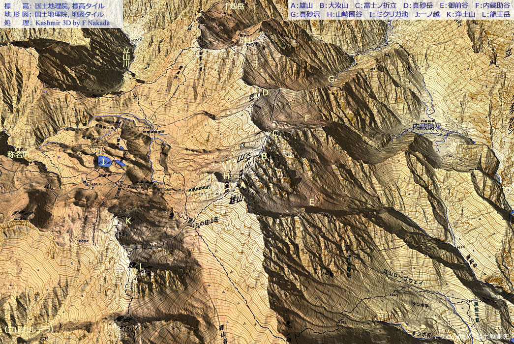 三次元地形図上でマウスクリックすると「5万分の1 地質図幅『立山』(出典,下記)」を表示します。 ダブルクリックで元に戻ります。![]() 5万分の1 地質図幅『立山』 の主な凡例は,ここをクリックしてください。 別ウィンドウで表示します。 |