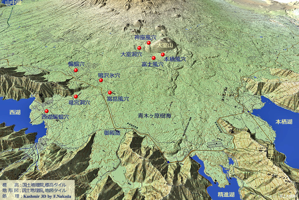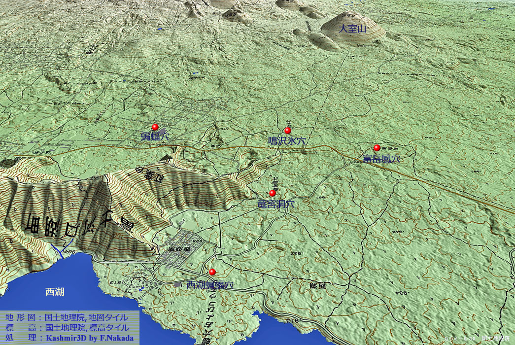 | 地形の三次元イメージ :蝙蝠穴洞穴群(蝙蝠穴,鳴沢氷穴,富岳風穴,龍宮洞穴,西湖蝙蝠穴) |