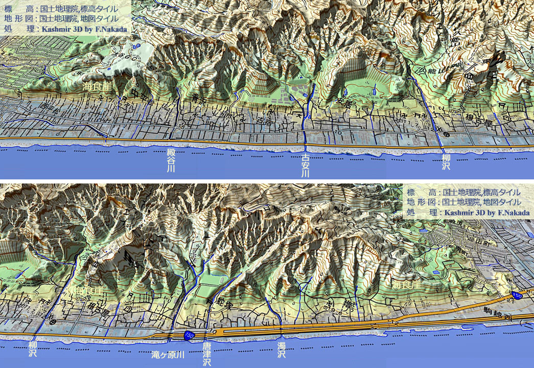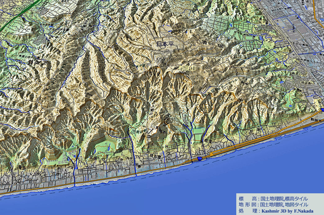 ![]() しかし,南に向かっては海岸の侵食があることと,大雨の降る方向性?などで,北面に比べて侵食が進み,団扇のような侵食地形が数多く存在します。 河川そのものは短いのですが,河床勾配が急なため侵食・運搬力が大きく,川の多くは「天井川」となっていました。 現在では,河川改修が進み,天井川は解消されています。 |