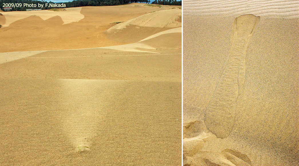 ![]() (左)僅かな突起の風下側には,風の作用による紋様が残されていました。 (右)乾いた砂山のリッジが崩れたのでしよう。 この写真を撮った時も,サラサラと崩れ続けていました。 |
