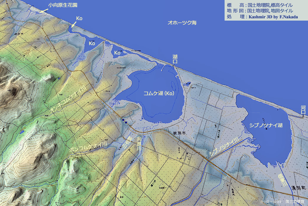 ![]() 3連の「コムケ湖」は,向かって左側で小さい方が上流で,右側の最も大きな湖が下流になります。 「人工水路」によりオホーツク海につながっているので,分類上は「汽水湖」でしょうか。 |
