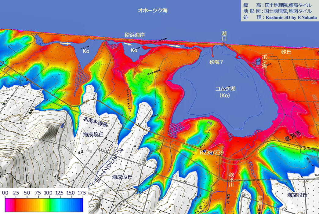 ‼マウスオーバー‼ 地図上にマウスを乗せてください。産総研・地質調査総合センターの「1/20万 シームレス地質図(出典,下記)」を表示します。![]() 紋別市の「コムケ湖」と「シブノツナイ湖」は,砂州によって海から切り離された潟湖(ラグーン)です。 海岸に沿って3つの湖が連なっている,という珍しい形をしています。 「湧別川」などから海に排出された土砂が「砂州」を作り,浅い海は切り離されたと想像します。 地質図には「湿原・湿地堆積物」の範囲が記載されていますが,空中写真で確認すると,消滅している場所もありそうです。 |