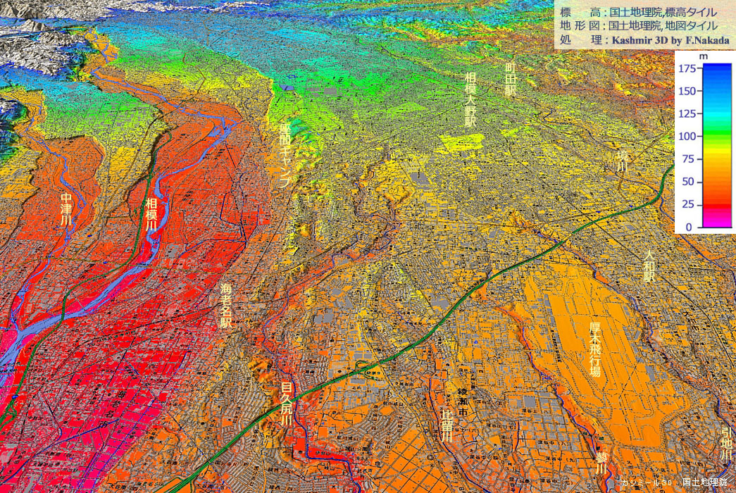 ‼マウスオーバー‼ 地図上にマウスを乗せてください。独自に作成した「標高段彩図」を表示します。![]() 「相模原台地(南部)」は,台地の北部が源流の中小河川と,武蔵野国と相模の国を分ける「境川」の支流群によって,かなり侵食・解析されています。 「引地川」と「境川」では,「湘南台駅」付近より下流部では,下刻侵食の段階は終了して「側方侵食」が優勢となっていて,幅広の河川敷となっています。 |