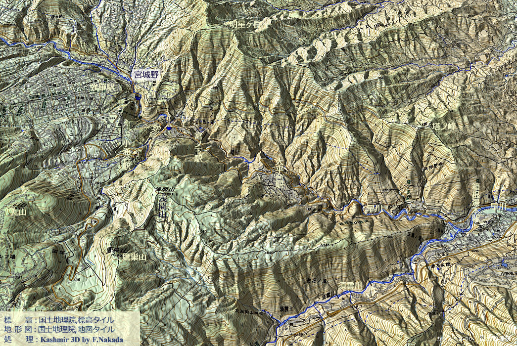| 地形(標高段彩図)の三次元イメージ : 早川渓谷 |