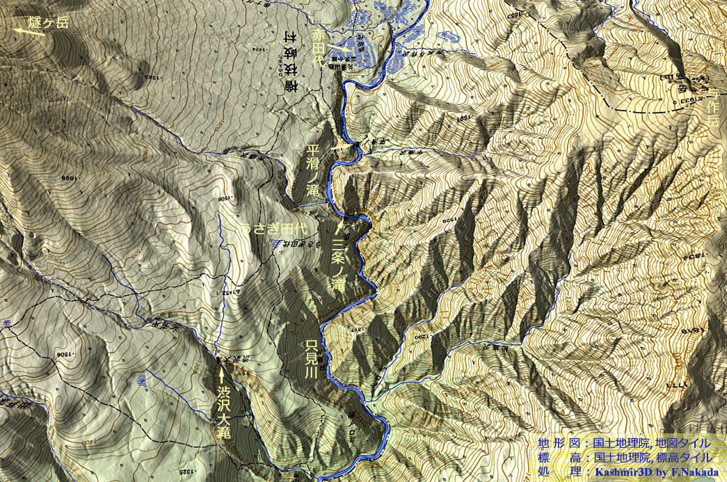 ![]() 尾瀬に関する資料で『「平滑ノ滝」の長さは500m程』という情報を見かけますが,実際,どこで始まってどこで終わっているのか,よくわかりません。 平滑ノ滝を流れ下った川水は,そのまま「三条ノ滝」に突入している,という印象です。 三条ノ滝と平滑ノ滝は,「尾瀬ヶ原」が上流なので,湧水期と梅雨時には,特に水量が多いことが知られています(現場写真参照)。 |