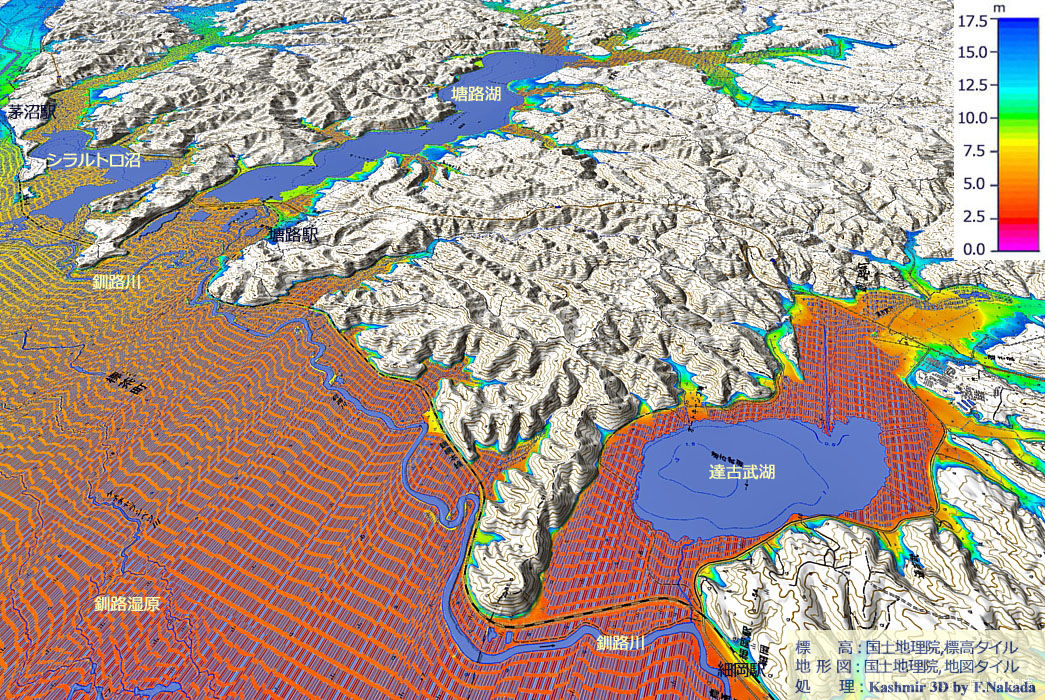 | 地形の三次元イメージ : 塘路湖,シラルトロ沼 |