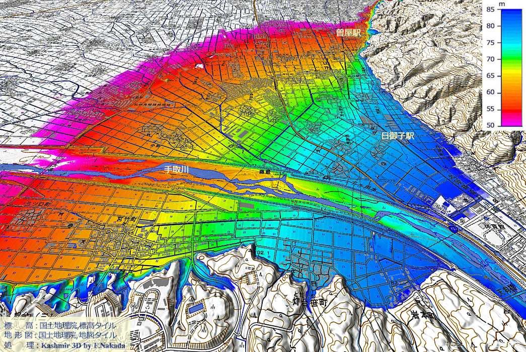 ![]() 「手取川」の「扇状地」は,きれいな扇型を呈していることが,「標高段彩図」によって確認することができます。 資料によると,かつては北の方角に流れていたらしいのですが,この標高段彩図からはまったく判別することができません。 決まった河道を作らずに,洪水の度にそれこそ気ままに流れていたのだろうと想像します。 |