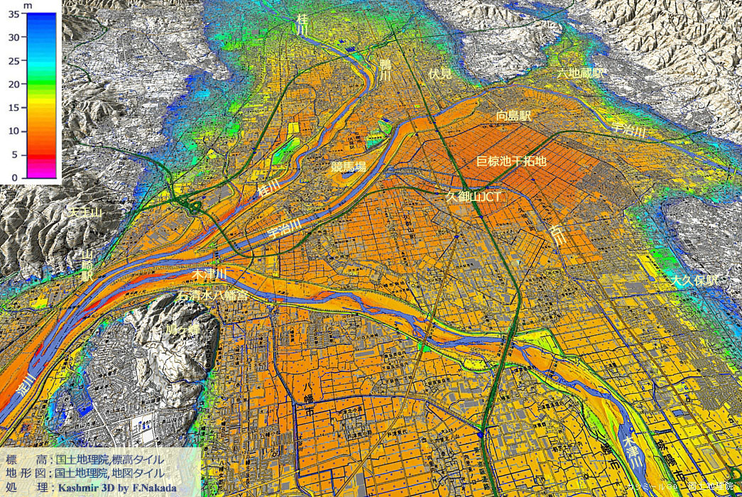 | 地形図と古地形図の三次元イメージ : 巨椋湖干拓地 |