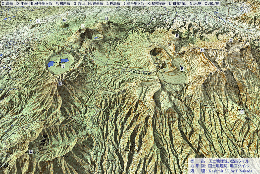 | 地形と地質の三次元イメージ : 上空北側からの阿蘇火山中央火口丘群 |
