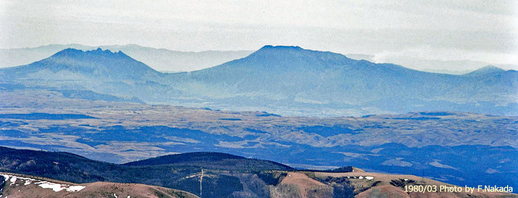 ![]() 九重連山の一つ「涌蓋山」の山頂から撮影した中央火口丘群です。 左から「根子岳」,「 高岳」,「中岳」と白くたなびく噴煙で,一番右端が「烏帽子岳」と続きます。 お釈迦様が寝ている様子,とも言われています。 |
