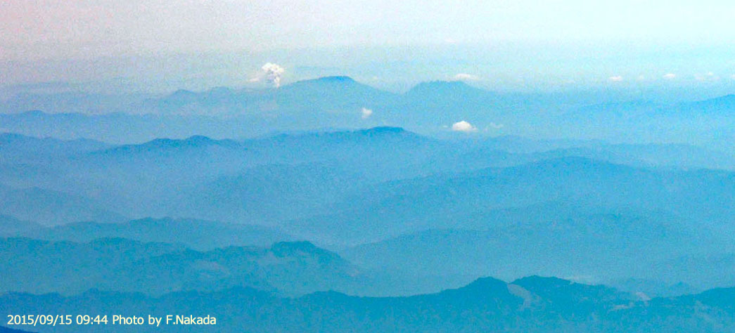 ![]() 2015年9月14日。 宮崎県沖上空の飛行機から撮影したものです。 噴煙が2000m上空まで上り,小規模の火砕流が発生したそうです。 上の写真と,左右が逆になっており,釈迦の顔に擬せられる「根子岳」は一番右にあります。 |