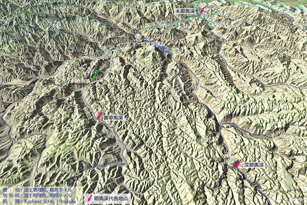 ‼マウスオーバー‼ 地図上にマウスを乗せてください。産総研・地質調査総合センターの「1/20万 シームレス地質図(出典,下記)」を表示します。![]() 「耶馬渓」は,「山国川」水系に属する多くの支流が開析(侵食)した「峡谷」で,極めて広い範囲に分布しています。 元々は,「青の洞門」が存在する場所のみが耶馬渓だったと思われますが,現在では単に耶馬渓と言うと「深耶馬渓」を指すようです。 それは,「開析谷」の規模(崖の高さや幅)が,本耶馬渓よりも深耶馬渓や裏耶馬渓のほうが大きくて,地形がダイナミックだからと思われます。 注 地図上に示した「斜面崩壊」の詳細については,下記のリンク先(産総研)を参照してください。 |