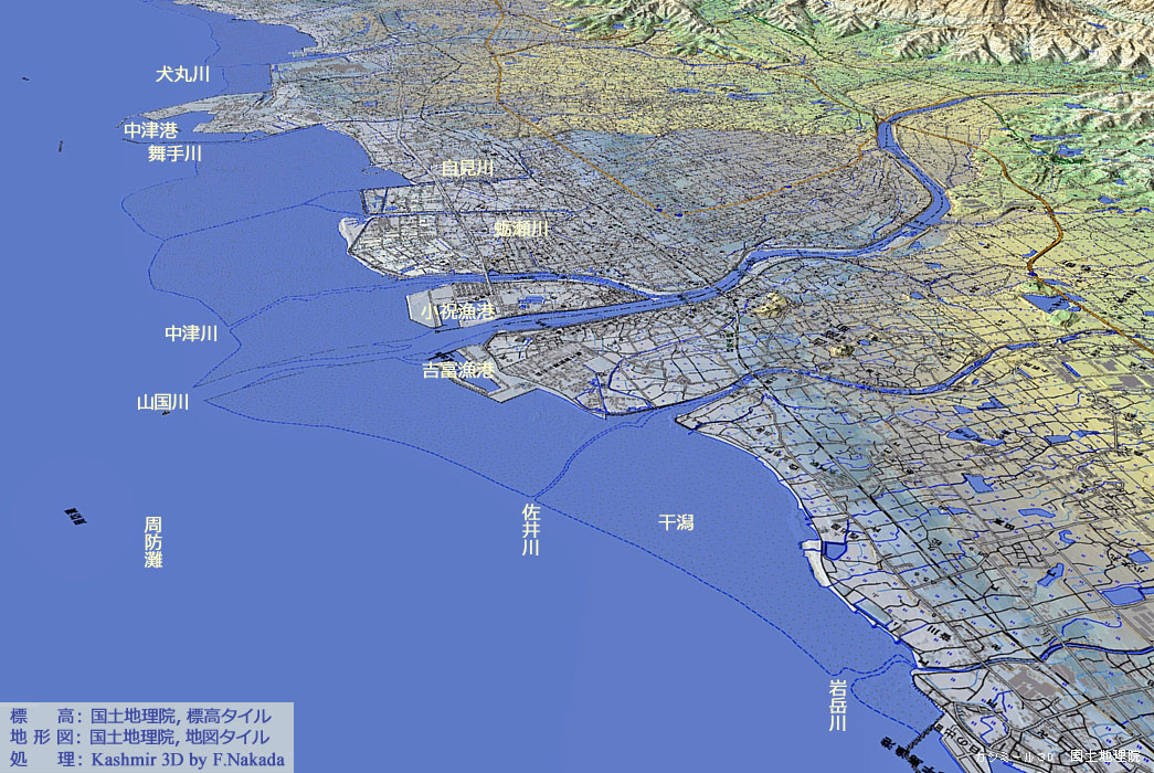 | 地形の三次元イメージ :山国川などによる広大な干潟 |