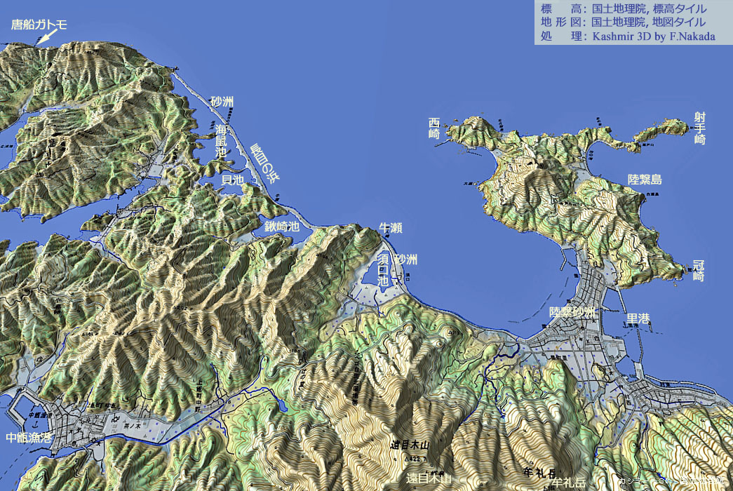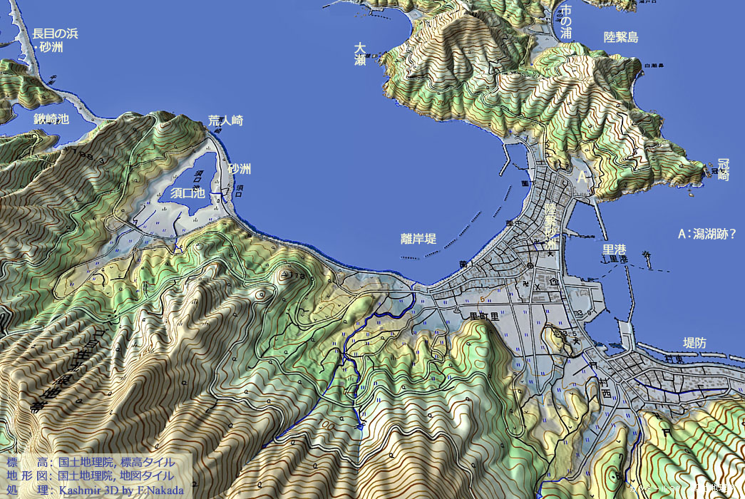 | 三次元地形モデル : 須口池と陸繋砂洲 |