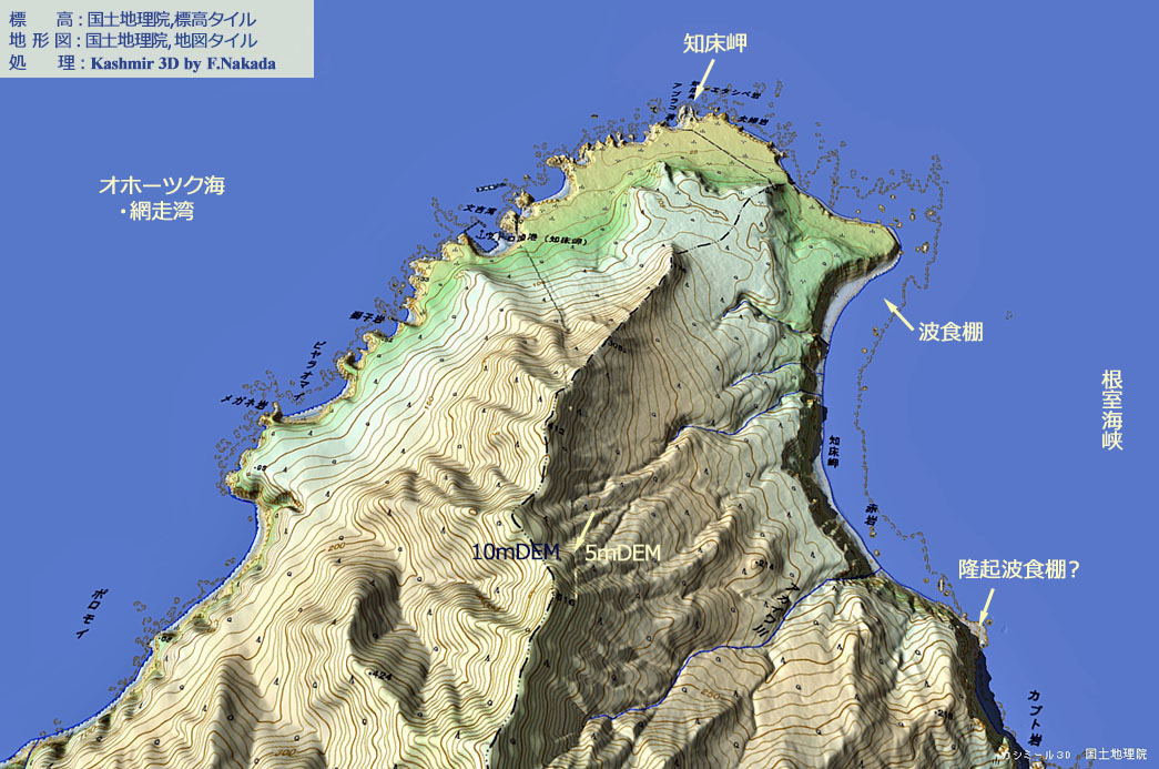 ![]() 「中位段丘面(M)」は,羅臼側にしか存在しません。 また,「波食棚」も,面積的には羅臼側の方がはるかに広大です。 |