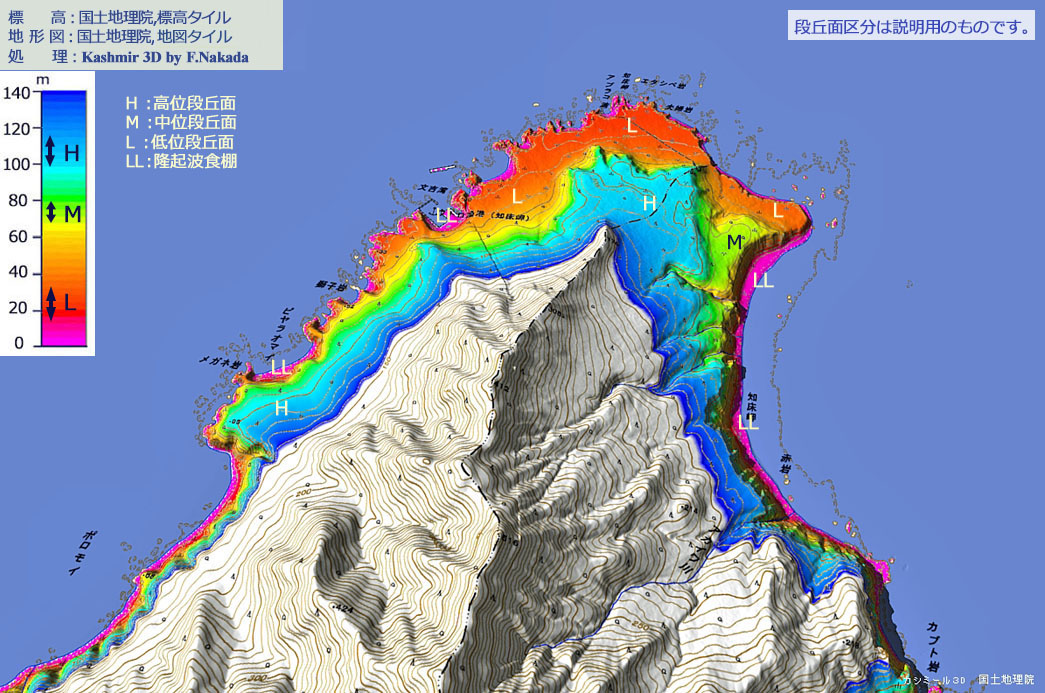 ![]() 標高140mまでの「標高段彩図」を作製してみました。 100m超の「高位段丘面(H)」,70m前後の「中位段丘面(M)」と,20m~30mの「低位段丘面(L)」が存在ますが,面積的には(L)が最も広いようです。 更に,海中には「波食棚」が存在するので,将来的には大地の隆起などによって,4つの段丘面が存在するようになるかもしれません。 波食棚は,オホーツク海側よりも根室海峡側の方がはるかに広大です。 |