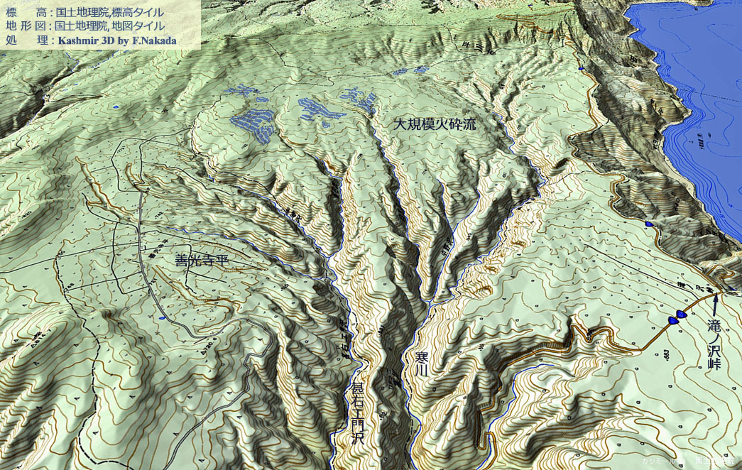 ![]() 十和田カルデラの北西部に位置する「善光寺平」付近です。 大規模火砕流(溶結凝灰岩)に覆われています。 奥入瀬渓谷と条件はほぼ同じと思われますが,こちらは河川による「谷頭侵食」の手が,徐々に外輪山へと延びている状況です。 「甚右エ門沢」も「寒川(ひやっこがわ)」も「V字谷」のようなので,これらの谷と奥入瀬渓谷の成因は違うように思えます。 |