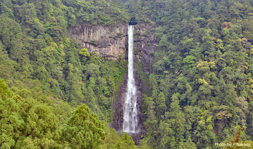 ![]() 大滝のちょうど半分の高さに「段」があるので,滝口からの水は滝壺に直接落ちるわけではありません。 大滝の上部は,花崗岩の「板状節理」が分布し,中間より下は「柱状節理」が分布する,とのことですが,水しぶきでよくわかりません。 |