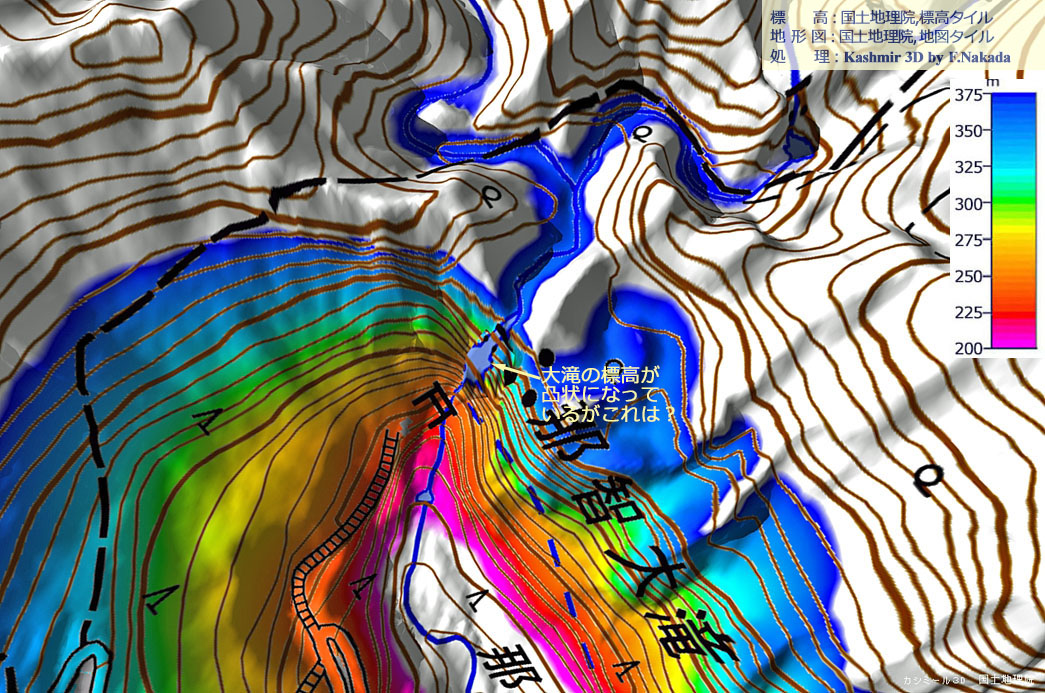 ![]() 那智大滝本体が凸状に盛り上がっています。 標高データが現実と乖離しているのは間違いないでしょう。 |
