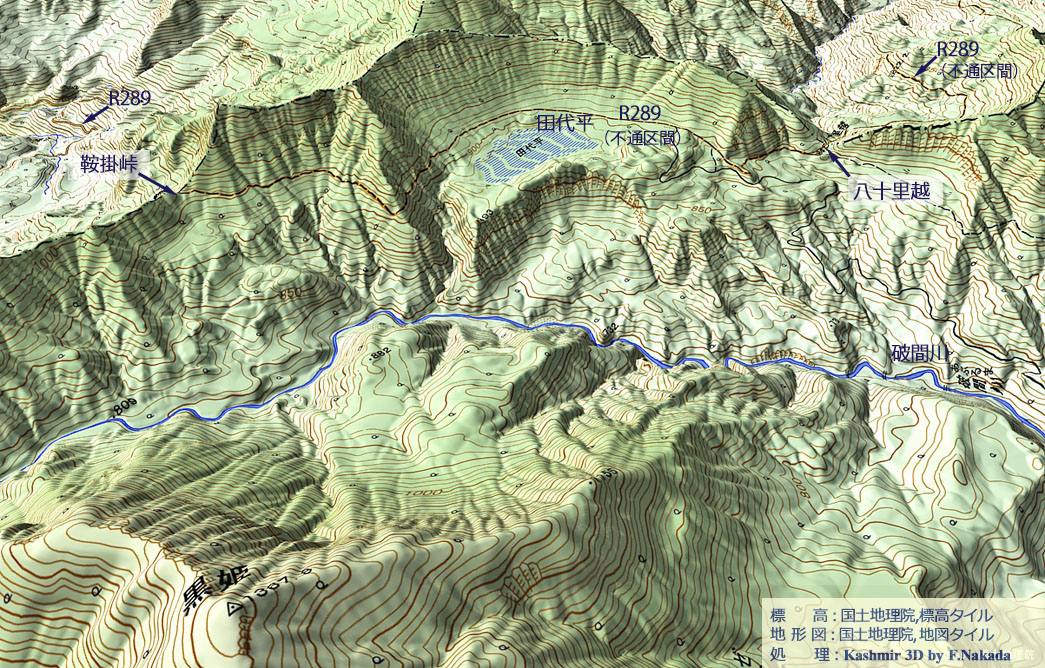 ‼マウスオーバー‼ 地図上にマウスを乗せてください。防災科研の「地すべり地形分布図」を表示します。![]() 「八十里越」~「鞍掛峠」の間を通る国道289号は,昔の八十里越街道に重なるのですが,この区間全てが「地すべり地」です。 「田代平」の湿地帯は,背後の尾根の前面が全て滑り落ちて「移動体」となり,偶然にできた凹地に水が溜ったものです。 この地すべり移動体は,よほど大きな体積を持っていたようで,田代平の直下に「二次すべり」が発生しています。 恐らく,移動体によって「破間川(あぶるまがわ)」は堰き止められ,いわゆる「天然ダム(土砂ダム)」が形成されたことでしょう。 国道が289号が,この地を避けて別ルートで建設されていることから,道路を建設できるほどには安定していない,と思われます。 |