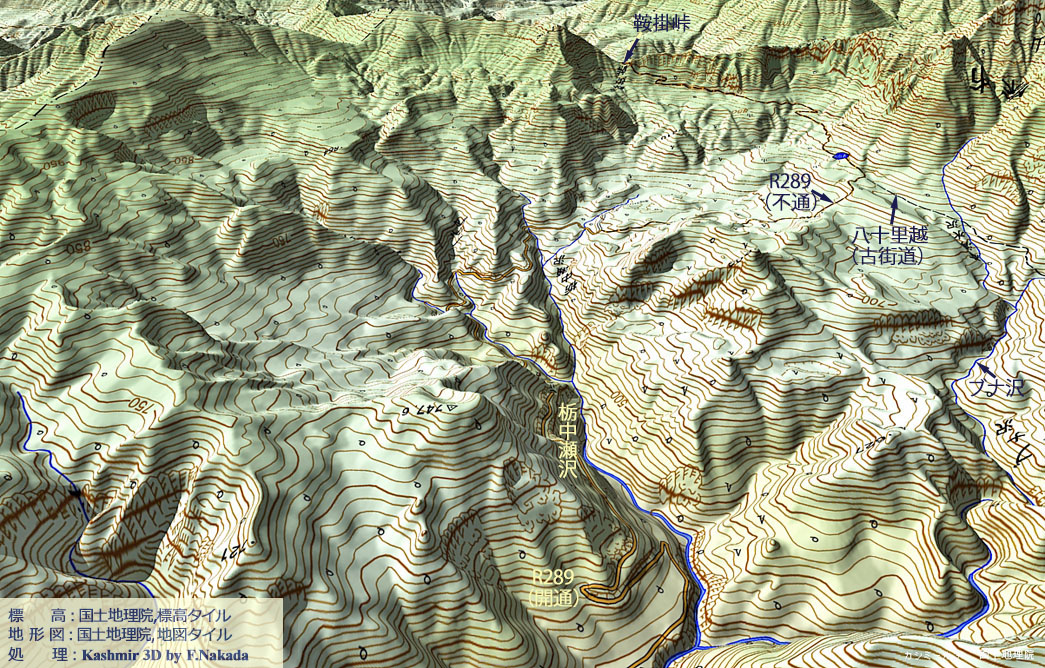 ‼マウスオーバー‼ 地図上にマウスを乗せてください。産総研・地質調査総合センターの「1/20万 シームレス地質図(出典,下記)」を表示します。![]() 「八十里越」は,新潟県の三条市から同県魚沼市を経由して福島県の只見町に至る古街道です。 現在は国道289号に指定されていますが,地すべり地帯のため通行が禁止され,別ルートが工事中です。 鋭い尾根のあるところ以外は,殆ど「地すべり地」であると言っても過言ではありません。 |
