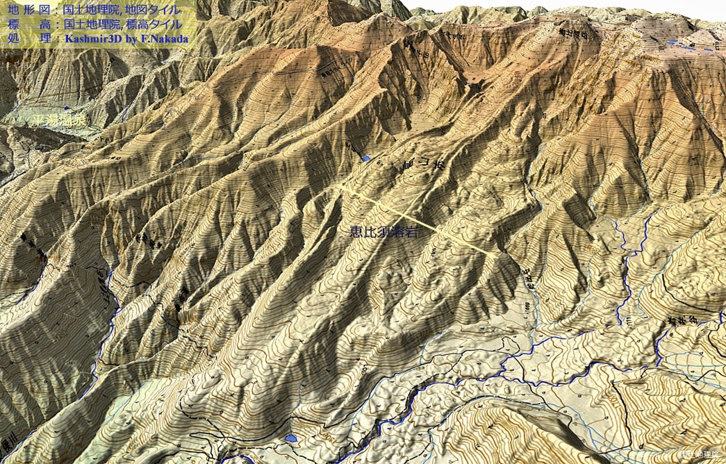 | 地形の三次元イメージ : 複雑な流れ方をした「恵比須岳溶岩」 |