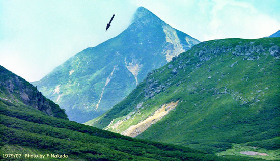 ![]() 鶴ヶ池近くからの烏帽子岳。 左側,ガスの湧いているところが,山体崩壊した斜面です。 |