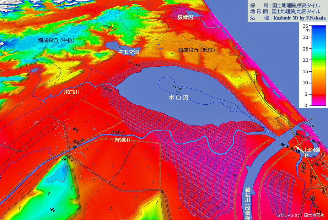 ![]() 広大な「海成段丘」に囲まれた奥地に,「カムイト沼」は存在します。 その意味では,上図の「キモマ沼」も同様の環境にあります。 どちらの沼も,標高は約5mとほぼ同じなので,距離は離れていても,ほぼ同時に形成された「潟湖」と考えられます。 |