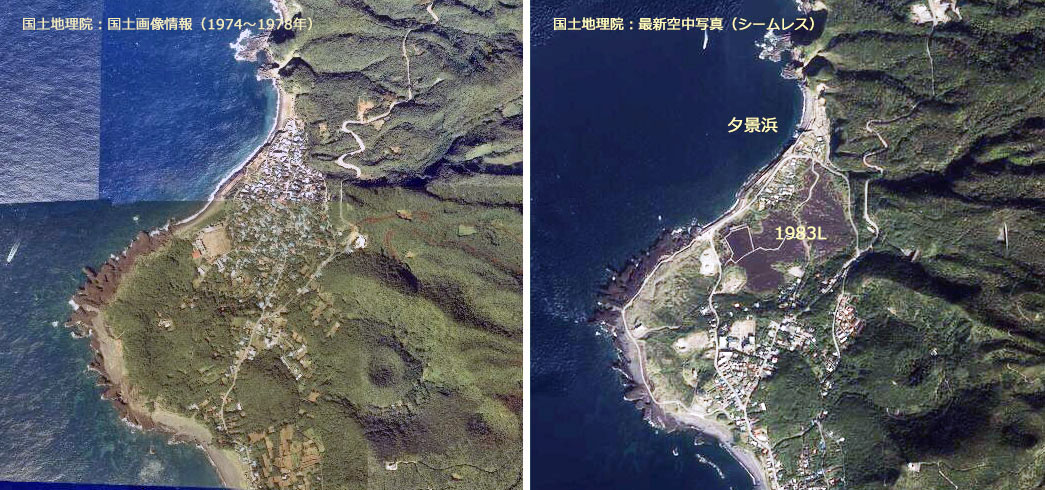 ![]() 写真1 1983Lの状況その1 夕景浜近くの阿古集落に溶岩が押し寄せ,多くの建物が飲み込まれたり焼失しました。 |