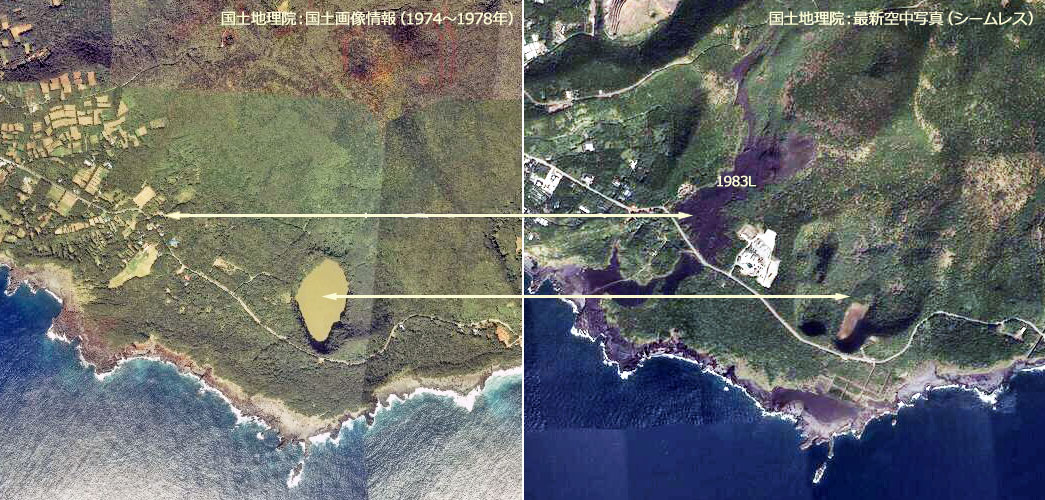 ![]() 写真2 1983Lの状況その2 1983年の噴火により,新澪池は姿かたちを変えてしまいました。 また,粟辺地区を溶岩流が通過してゆきました。 |