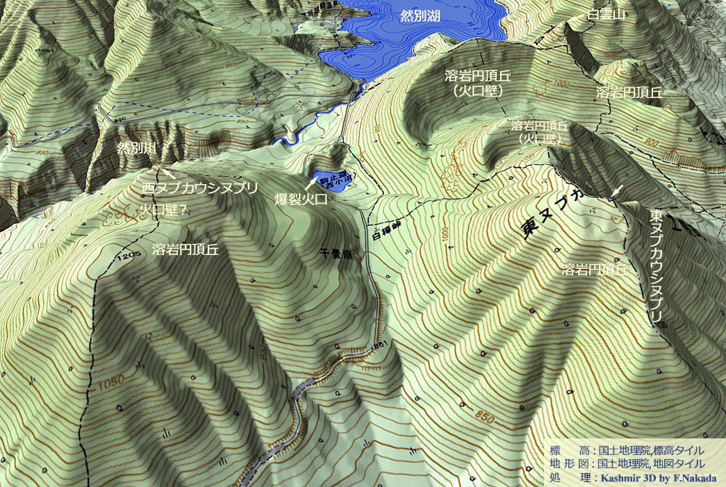| 地形の三次元イメージ : 然別火山群(溶岩円頂丘,爆裂火口) |