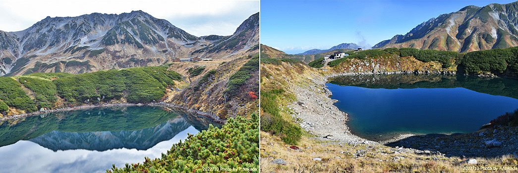 ![]() 「ミドリガ池」は,楕円形をした「爆裂火口」です。 火口自体も細長くなっており,写真(左)のように上流部にも小さな池が存在しています。 一方,写真(右)のように,池の最下流部から少量の水が溢れ出ています。 未確認ですが,「ミクリガ池」に注いでいると思われます。 |