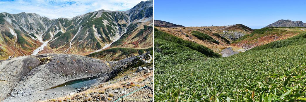 ‼マウスオーバー‼ 地図上にマウスを乗せてください。産総研・地質調査総合センターの 5万の1地質図幅「立山」(出典,下記)を表示します。![]() 種々の資料をまとめると,室堂平では「ミクリガ池」,「ミドリガ池」,「りんどう池」,「血の池」一帯や「玉殿岩屋」周辺部 等に見られる「凹地(窪地)」の大部分が「火口(爆裂火口)」と評価されています。 一方,「称名川」の侵食域では,「山崎カール」などに代表される,「氷河」由来の岩屑が広範囲に堆積しています。 まとめると,基本的に室堂平は火山性地形なのですが,氷河によって運ばれてきた堆積物が生んだ地形が混在しています。 |
